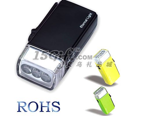 1. ABS 外殼. 2. 三顆高亮度LED(45000MCD) 3. 鎳氫電池,電壓: 3. 6V, 容量: 80mAH. 正常操作,電池可反復充電至少500次以上4. 每分鐘120轉勻速搖動手柄,輸出功率 1.2W. 手搖一分鐘,可支持LED照明15-20分鐘.5. 手搖可以對手機應急充電,手搖1分鐘支持手機通話2-8分鐘或待機40-50分鐘.(注:不同的手機時間都有不同)