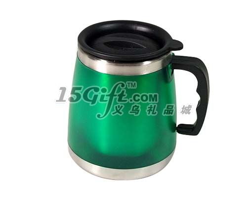 杯子內(nèi)壁為不銹鋼,外壁為塑料,可做各種logo,美觀實(shí)用,高12cm,上口徑8.5cm,下口徑10cm