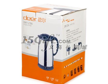 型號:DR1236材質(zhì):不銹鋼規(guī)格:1-2升加熱方式:不銹鋼底盤加熱額定電壓:220V電熱水壺功率:1500W-2000W寶貝描述:獨(dú)特的自動保溫設(shè)計(jì),不拔電源可持續(xù)保持水溫,即使拔掉電源線,也能保溫4個(gè)小時(shí)!高級不銹鋼壺身,材質(zhì)渾厚,結(jié)實(shí)耐用特制高分子材料,雙重隔熱,燒水時(shí)壺身溫度不高,既省電又安全。自鎖式隔熱壺蓋,一按即開,帶有隔熱蒸汽設(shè)計(jì),取水方便。底盤不銹鋼加熱,加熱速度快,1.5L只需5分鐘。防干燒保護(hù)設(shè)計(jì),水沸自動斷電。360˙任意旋轉(zhuǎn)壺身方便取水,電源線收藏設(shè)計(jì)等人性化設(shè)