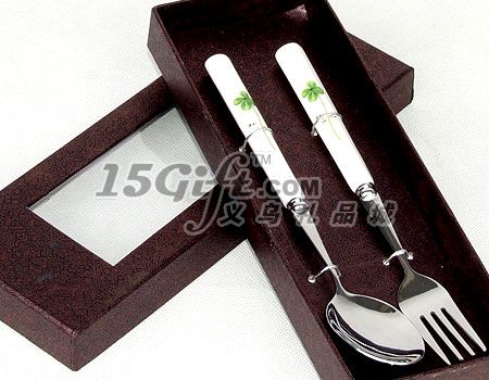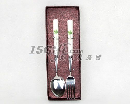 產(chǎn)品為大號陶瓷手柄餐具,logo可以激光做在不銹鋼部位,開窗特種天地蓋紙盒包裝,精美大方,勺子和叉子長度為:19.5cm