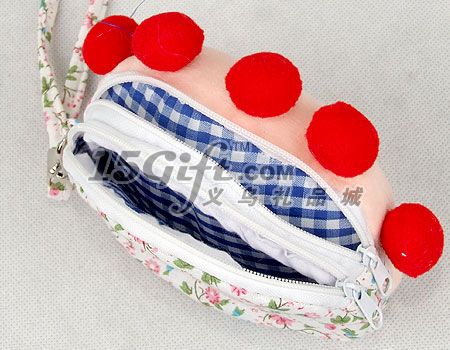 雙層拉鏈包,內(nèi)填充高彈PP棉,錢包部分是花棉布材質(zhì),10個(gè)裝一個(gè)OPP袋。包包尺寸:12.5*10cm,提手長(zhǎng)13.5cm。