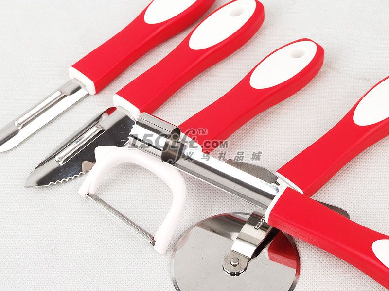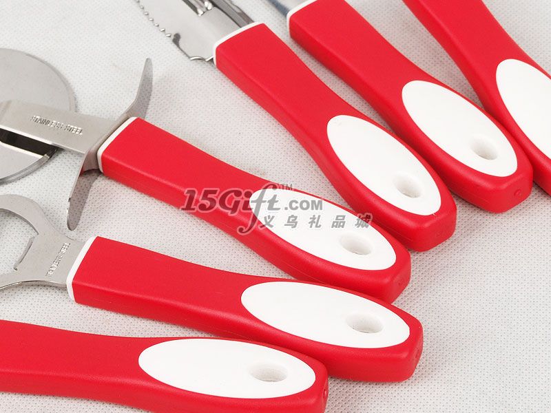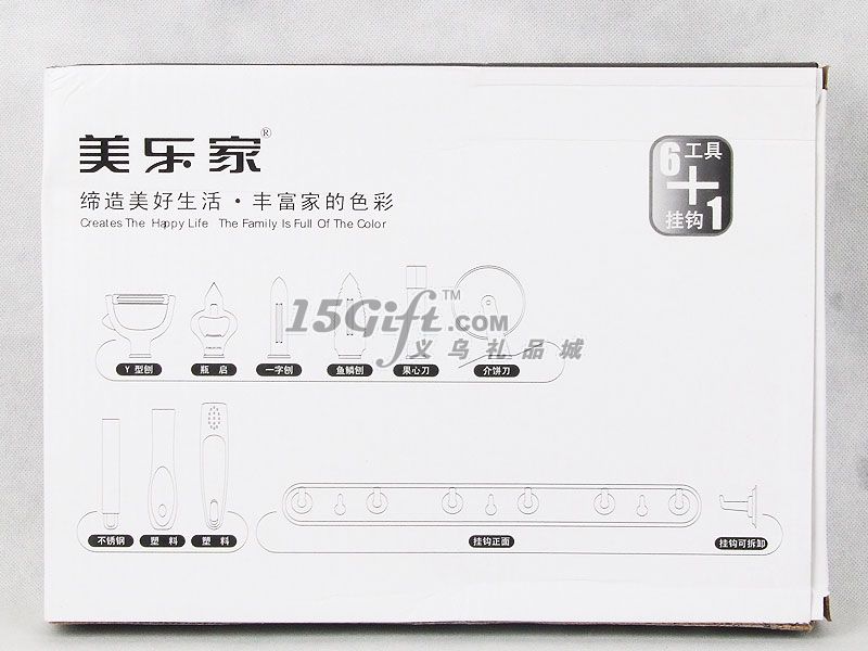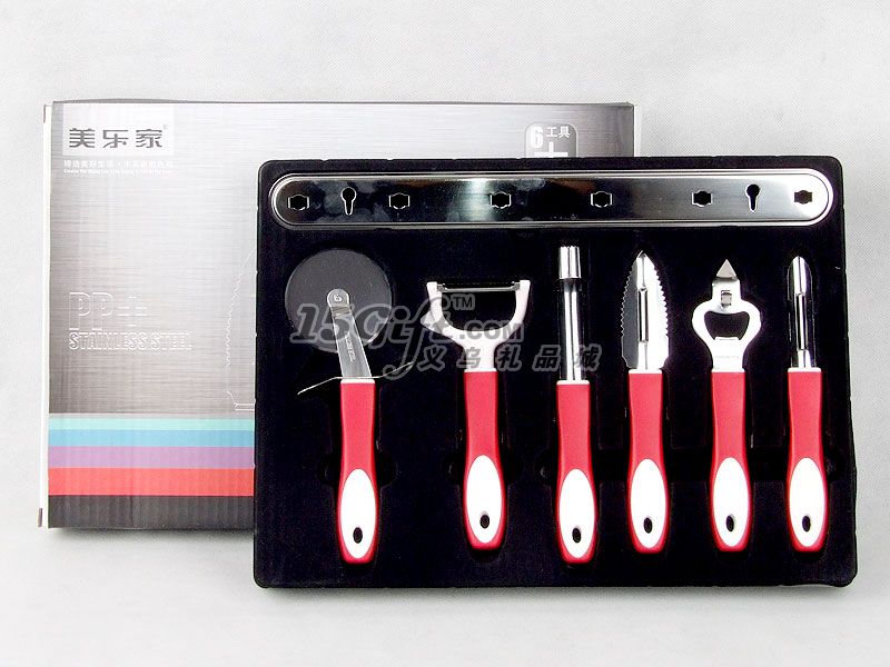 彩色紙盒包裝,內(nèi)含:介餅刀(直徑6.2*19.5cm)+Y型刨(6.5*16.5cm)+果心抽(長19.3cm)+魚鱗刨(3*18.7cm)+瓶啟(4.3*17.5cm)+一字刨(1.6*18.2cm)+掛鉤(3.6*35cm)