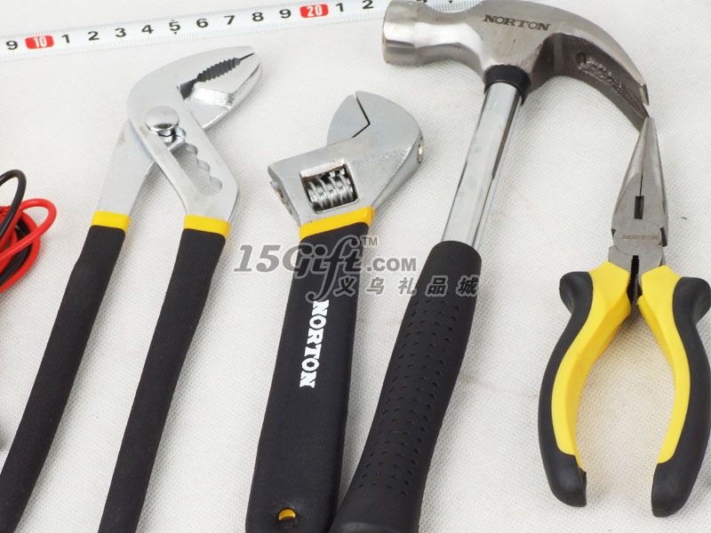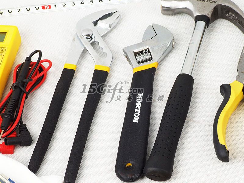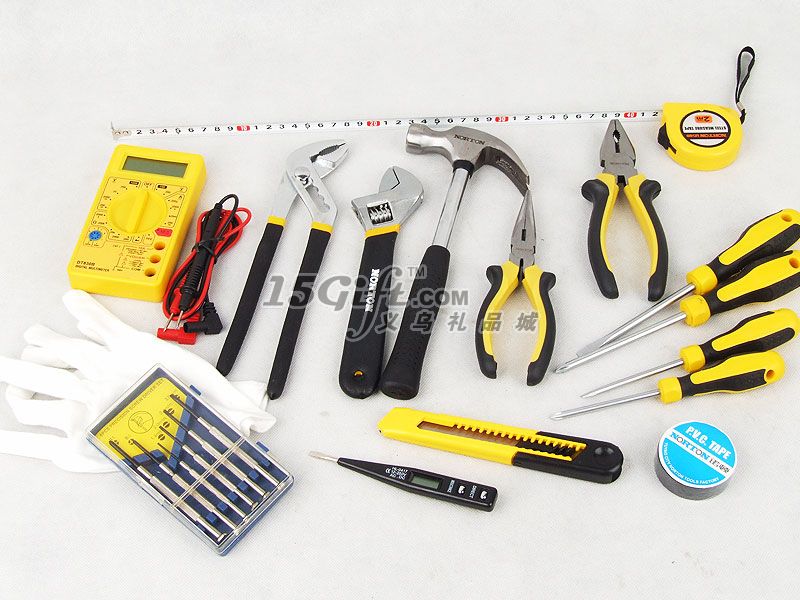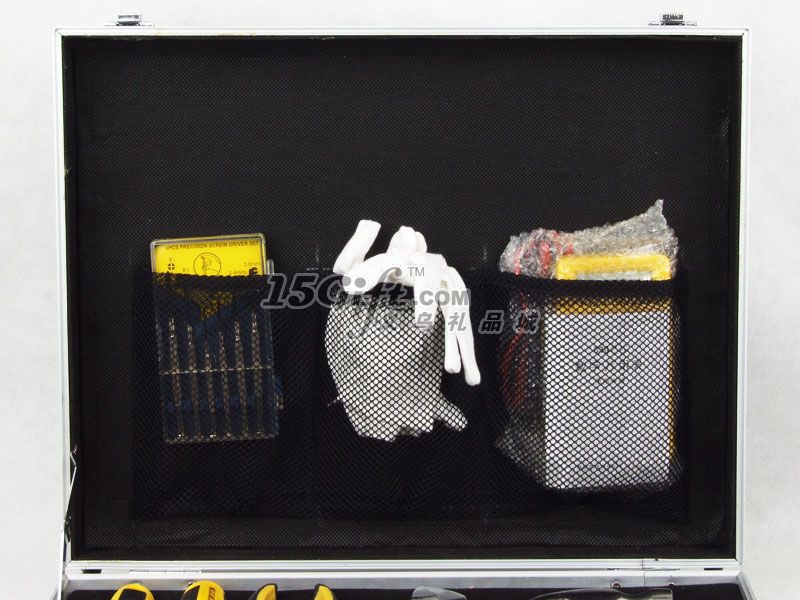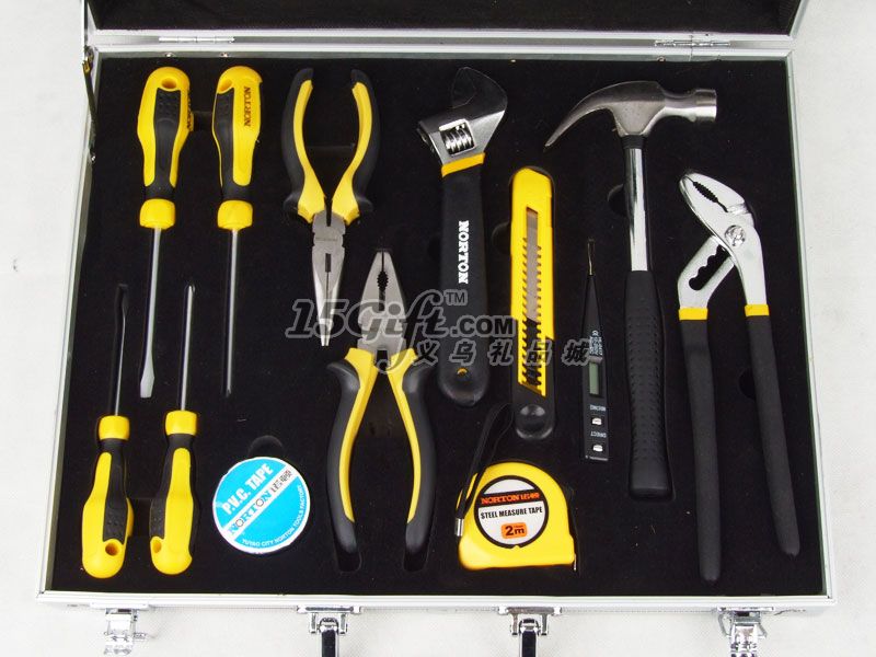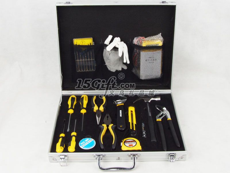 鋁合金手提盒,EVA內(nèi)襯,內(nèi)含:一字螺絲刀2把(長16.5cm和20.5cm),十字螺絲刀2把(長16.5cm和20.5cm),尖嘴鉗(長17cm),扳手(5*20cm),鉗子(長16cm),2M卷尺,美工刀(2*16cm),電筆(1.3*13cm),錘子(10*24cm),大力鉗(5*23cm),手套1付,小螺絲刀套裝1盒(內(nèi)含6個),電表1個,絕緣膠帶1卷。