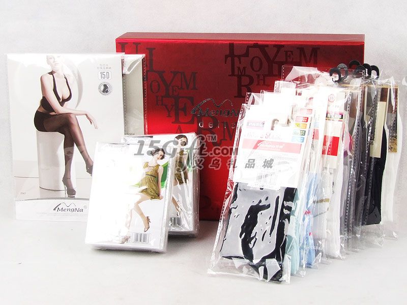 ,襪子分別為(1雙包芯絲珍珠連褲襪、1雙20D包芯絲單加檔連褲襪、6雙原子彈精品男襪、6雙夢娜時尚女棉襪)襪子顏色、款式、功能可以按照要求配,包裝盒上可以按要求制作商標(biāo),