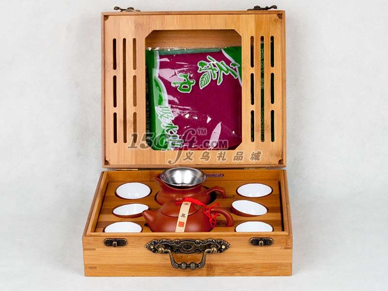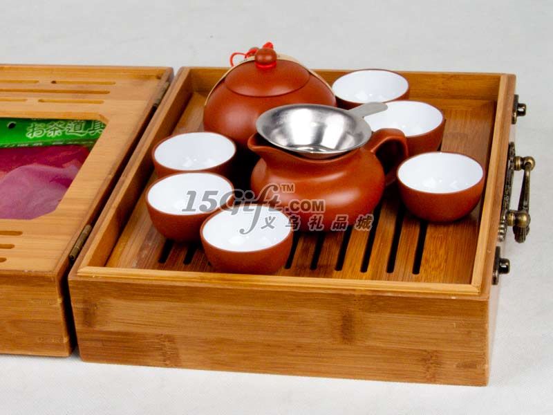 產(chǎn)品由:紫砂小杯子6個,紫砂茶壺1個,紫砂公道杯1個,不銹鋼過濾網(wǎng)1個,茶巾一塊,竹制盒子(茶盤)一個,手提袋一個組合而成,竹盒子上可以按要求印刷或者刻商標。
