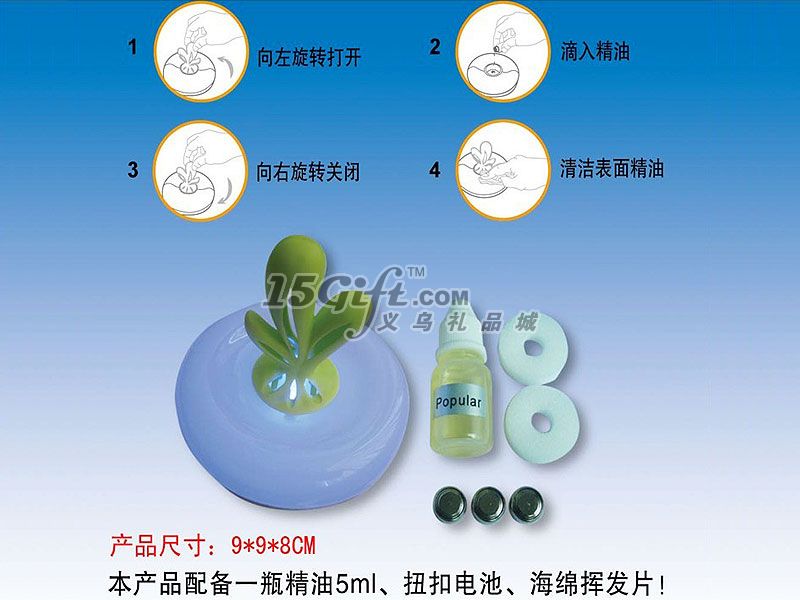 產(chǎn)品描述:變色綠葉香薰燈內(nèi)置變色LED,采用3節(jié)AG13紐扣電池供電,產(chǎn)品配備5ml精油、AG13紐扣電池、揮發(fā)片,單個(gè)彩盒包裝。產(chǎn)品可以按要求制作商標(biāo),適合做為銀行積分禮品,汽車禮品,酒店禮品,房產(chǎn)禮品等做為廣告促銷禮品,歡迎前來咨詢訂購(gòu)。