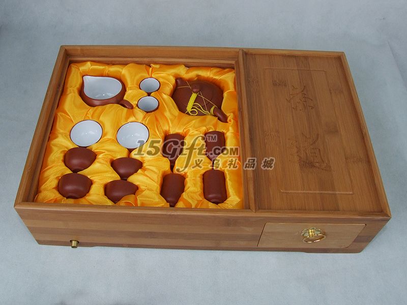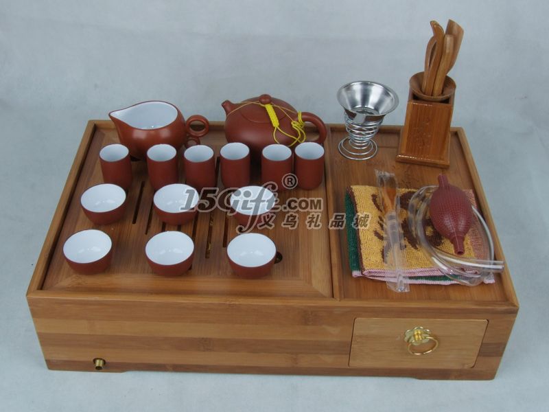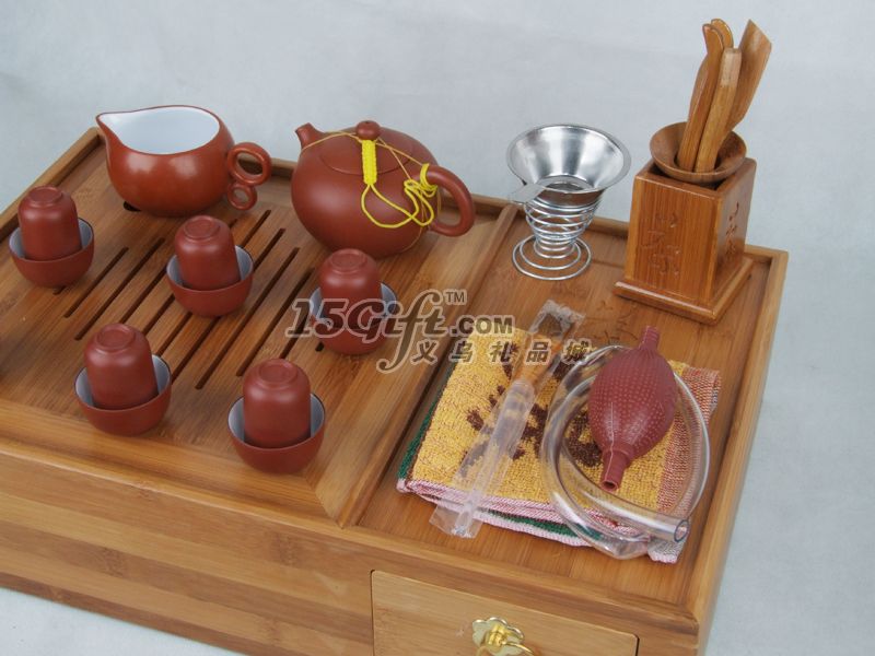 配有1個(gè)竹木茶盤(pán),1個(gè)紫砂壺,6個(gè)紫砂茶杯,6個(gè)聞香杯,1個(gè)不銹鋼茶漏,1個(gè)不銹鋼茶托,1個(gè)茶海, 1套六君子,1根養(yǎng)壺刷,1塊茶巾。