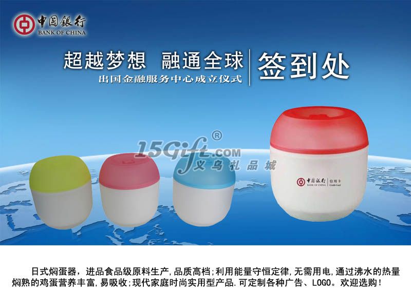 產(chǎn)品特點(diǎn):進(jìn)品食品級原料生產(chǎn),品質(zhì)高檔;利用能量守恒定律,無需用電,通過沸水的熱量燜熟的雞蛋營養(yǎng)豐富,易吸收;現(xiàn)代家庭時尚實(shí)用型產(chǎn)品