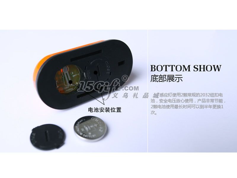 推開后蓋,安裝2節(jié)紐扣電池,即可點(diǎn)亮。低電壓工作,安全可靠。背部可使用磁鐵,雙面膠。并可以選用另購的夾子。