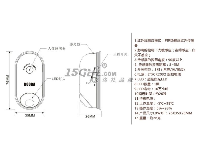 LED感應(yīng)燈,通過人體熱釋紅外感應(yīng),長(zhǎng)壽持久型LED顆粒,經(jīng)久耐用。具有關(guān)閉(OFF)、常亮(ON)、自動(dòng)感應(yīng)(AUTO)三種狀態(tài)。在自動(dòng)感應(yīng)模式時(shí),具有人體感應(yīng)、光控和時(shí)控功能。無需開關(guān)、感應(yīng)即亮、方便簡(jiǎn)單,造型簡(jiǎn)潔,體形小巧,使用方便。重復(fù)使用型雙面膠,可方便堅(jiān)固的固定于光滑表面。