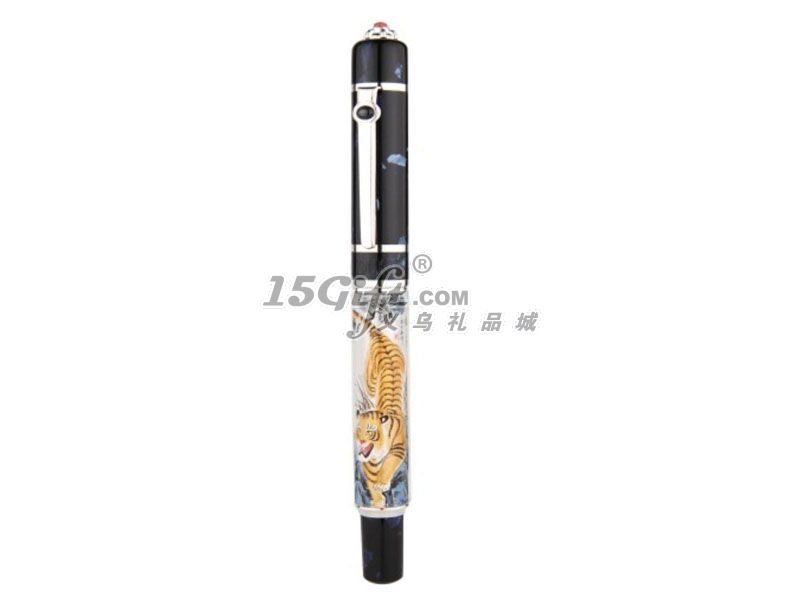 筆頂帽珊瑚珠寶具有吉祥富貴的象征中國(guó)西藏的佛教徒視紅色珊瑚為如來(lái)佛的化身,是佛教七寶之一,古代二品大員的頂戴以珊瑚為標(biāo)志。筆夾上端鑲嵌藍(lán)寶石以白金包飾,包括,所有的零部件 。筆桿采用水晶玻璃桿配以“中國(guó)一絕”的內(nèi)畫(huà)手法,選用上等的顏料,勾勒出一副猛虎下山圖。筆尖采用14K黃金,外加白金包飾,制作而成.盒子,外表采用高級(jí)鋼琴烤漆,手工打磨而成鋼琴烤漆內(nèi)層,有王嘯中先生專(zhuān)畫(huà)虎王圖鋼琴烤漆是采用金屬PU片,題詞而成“東方虎下山,金額戴皇冠。喜得長(zhǎng)風(fēng)力,聲威動(dòng)宇寰!