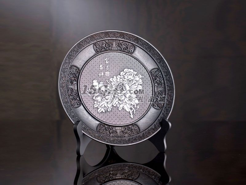木雕工藝在中國有著悠久的歷史,它廣泛運用于家具及民間工藝用品之中, 并作為一種獨立的藝術(shù)形式而傳承著。 純錫浮雕裝飾用在傳統(tǒng)的紅木雕花盤上,賦予了作品新的審美含義,紅木的古樸厚重與純錫的內(nèi)斂典雅達到了完美的統(tǒng)一,使作品層次分明,寓意深刻,將中國式的內(nèi)斂美學(xué)展現(xiàn)得淋漓盡致。