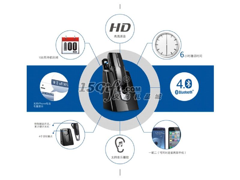1. 6小時 通話時間2. 10米 通話距離3.100天 待機時間4.支持單聲音樂播放5.數(shù)碼信號處理降噪