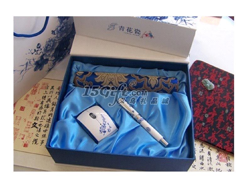 絲綢鼠標墊+青花折疊鼠標+青花陶瓷筆